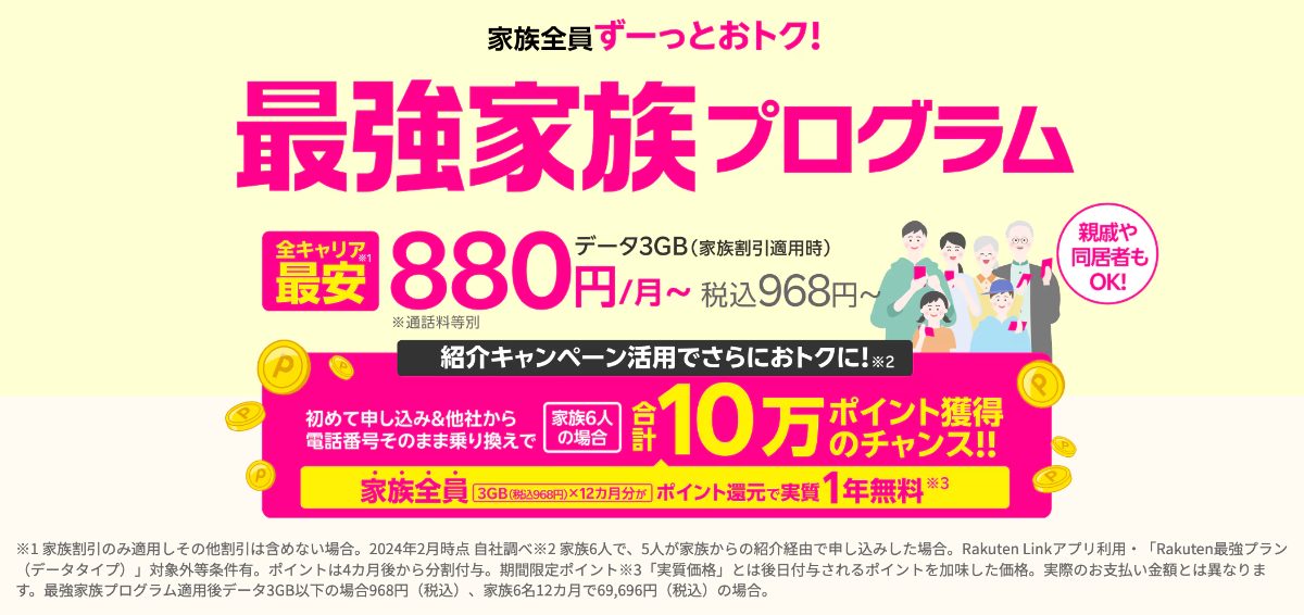 楽天モバイルは最強家族プログラムにて、最大20回線まで毎月110円割引されます。