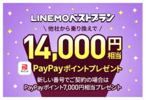 - 特典:LINEMOベストプラン契約の場合、最大14,000円相当のPayPayポイント